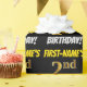 This wrapping paper design features a message like "FIRST-NAME’S 2nd BIRTHDAY!", with the "2nd" having a faux/imitation gold-like colour appearance, and with the name and "BIRTHDAY" in a fun, bold font. The name can be personalised, and the background is coloured black. Wrapping paper like this could perhaps be used when wrapping birthday gifts being given to somebody in celebration of their second birthday. [~Z0000203]