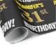 This wrapping paper design features a message like "JENNIFER’S 31st BIRTHDAY!", with the "31st" having a faux/imitation gold-like colour appearance, and with the name and "BIRTHDAY" in a fun, bold font. The name can be personalised, and the background is coloured black. Wrapping paper like this could perhaps be used when wrapping birthday gifts being given to somebody in celebration of their thirty first birthday. [~Z0000203]