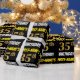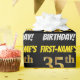 This wrapping paper design features a message like "FIRST-NAME’S 35th BIRTHDAY!", with the "35th" having a faux/imitation gold-like colour appearance, and with the name and "BIRTHDAY" in a fun, bold font. The name can be customised, and the background is coloured black. Wrapping paper like this could perhaps be used when wrapping birthday gifts being given to somebody in celebration of their thirty fifth birthday. [~Z0000203]
