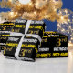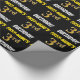 This wrapping paper design features a message like "FIRST-NAME’S 3rd BIRTHDAY!", with the "3rd" having a faux/imitation gold-like colour appearance, and with the name and "BIRTHDAY" in a fun, bold font. The name can be customised, and the background is coloured black. Wrapping paper like this could perhaps be used when wrapping birthday gifts being given to somebody in celebration of their third birthday. [~Z0000203]