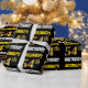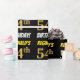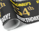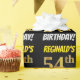 This wrapping paper design features a message like "REGINALD’S 54th BIRTHDAY!", with the "54th" having a faux/imitation gold-like colour appearance, and with the name and "BIRTHDAY" in a fun, bold font. The name is customisable, and the background is coloured black. Wrapping paper like this could perhaps be used when wrapping birthday gifts being given to somebody in celebration of their fifty fourth birthday. [~Z0000203]