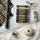 This wrapping paper design features a message like "REGINALD’S 58th BIRTHDAY!", with the "58th" having a faux/imitation gold-like colour appearance, and with the name and "BIRTHDAY" in a fun, bold font. The name is customisable, and the background is coloured black. Wrapping paper like this could perhaps be used when wrapping birthday gifts being given to somebody in celebration of their fifty eighth birthday. [~Z0000203]