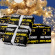 This wrapping paper design features a message like "FIRST-NAME’S 5th BIRTHDAY!", with the "5th" having a faux/imitation gold-like colour appearance, and with the name and "BIRTHDAY" in a fun, bold font. The name is customisable, and the background is coloured black. Wrapping paper like this could perhaps be used when wrapping birthday gifts being given to somebody in celebration of their fifth birthday. [~Z0000203]