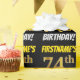 This wrapping paper design features a message like "FIRSTNAME’S 74th BIRTHDAY!", with the "74th" having a faux/imitation gold-like colour appearance, and with the name and "BIRTHDAY" in a fun, bold font. The name is customisable, and the background is coloured black. Wrapping paper like this could perhaps be used when wrapping birthday gifts being given to somebody in celebration of their seventy fourth birthday. [~Z0000203]