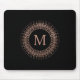 Add some sleek, chic style to your desk with this monogrammed mousepad. Design features a rich black background with your single initial monogram encircled by an intricate rose gold mandala pattern. NOTE: rose gold is a digital printed image with colour variations made to mimic real foil; it is not actual gold foil.