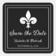 Elegant and simple Wedding Save the Date Stickers featuring a fleur de lis against a black background. This design is a unique choice for announcing a modern wedding. Easy to customise with your wedding details. Click "Customise It" to find more personalisation options.