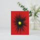 This postcard features a dramatic abstract design of a black flower with a golden yellow centre on a scarlet red background.