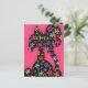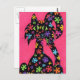 This friendly black cat sits against a vivid pink background, showing off her detailed multicolored flower-shaped markings in this uplifting design.