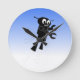 Toy flying robot in blue sky. Original cartoon character. Digital drawing.