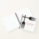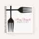 Simple black forks and custom coloured text on this personal cookbook notebook, perfect for you keepsake recipe collection.