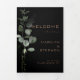 This black formal minimal trifold wedding program is perfect to compliment a rustic wedding. The design features watercolor green eucalyptus foliage in a black background.