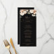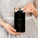 This black formal royal floral dinner menu card is perfect for a modern wedding. The design features watercolor pink, blush, and white elegant flowers with emerald green leaves.