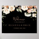 This black formal royal floral wedding welcome sign is perfect for a modern wedding. The design features watercolor pink, blush, and white elegant flowers with emerald green leaves.