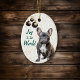 On the front of this Holiday ornament is an image of a beautiful black and white French Bulldog sitting in front of a gold confetti background. Black and gold tree bulb ornaments hang at the left side. Green text says "Joy to the World". The back of the ornament has the same confetti background and text fields for you to personalise each ornament, or just blank out the text if you prefer.
