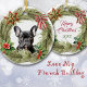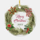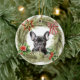This pretty Holiday ornament features an adorable black French Bulldog. The dog is framed with a pine bough wreath decorated with a red, green, and gold star which the dog is looking at. Also included is a striped bow and poinsettia and holly with red berries. The back of the ornament has the same wreath, with two text fields for you to customise.