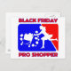 Professional sports red & blue symbol of a white silhouette of a woman frantically running with a loaded shopping cart, with products flying everywhere. Phrase, “Black Friday Pro Shopper” written below in fun block red lettering with blue outline.