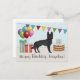 Destei's original cartoon illustration of a black colour German Shepherd breed dog. The dog is placed in a colourful birthday setting. There is a birthday cake with some candles on it, colourful birthday balloons and a bunting banner as well as two present boxes. There is also a personalizable text area.