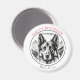 The round magnet features a striking black German Shepherd dog illustration that captures the beauty and strength of this majestic breed. The detailed artwork showcases the distinct features of the German Shepherd, including its pointed ears, alert expression, and confident stance. The black colour of the illustration adds a bold and timeless touch to the design, making it stand out on any magnetic surface.