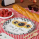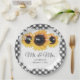 Personalized rustic black and white gingham and sunflower wedding paper plates featuring sunflower flowers and string lights on a gingham background. Matching items available to complement these rustic floral wedding paper plates. Easily personalize to any occasion.
