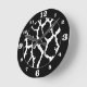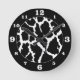 A bold black and white giraffe animal print is featured at the centre of this wall clock. The outer ring has a black background with white numbers to mark the hours. The larger numbers mark each quarter hour.