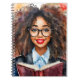 Notebook features watercolor artwork of a beautiful nerdy-looking black woman with big, curly natural hair wearing black-rimmed spectacles and red lipstick, holding a book against her chest. Academia aesthetic art featuring a melanin-rich student, scholar, teacher, bookworm, or librarian from the African diaspora.