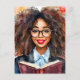 Postcard features watercolor artwork of a beautiful nerdy-looking black woman with big, curly natural hair wearing black-rimmed spectacles and red lipstick, holding a book against her chest. Academia aesthetic art featuring a melanin-rich student, scholar, teacher, bookworm, or librarian from the African diaspora.
