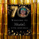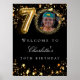 A welcome poster for a 70th birthday party. Black background and faux gold coloured stars. Personalise and add a name and photo.