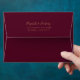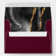 The inside of this elegant modern wedding invitation envelope features a black watercolor agate design trimmed with faux gold glitter. Customise the back flap with the names of the couple in gold-coloured handwriting script and return address in copperplate font on a burgundy background.