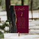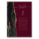 The left-hand edge of this elegant modern wedding table number card features a black watercolor agate border trimmed with faux gold glitter. The word "table" appears in gold-coloured handwriting script on a burgundy red background. Add the names of your guests who are assigned to each table.