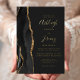The left-hand edge of this elegant modern wedding invitation features a black watercolor agate border trimmed with faux gold glitter. The customisable text combines handwriting, copperplate and italic fonts in real gold foil on an off-black background. The reverse side features a matching black and gold agate design.