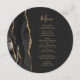 The left-hand edge of this elegant modern wedding menu features a black watercolor agate border trimmed with faux gold glitter. The customisable text combines gold-coloured whimsical handwriting script and copperplate fonts on a slate black background. The reverse side features a matching black and gold agate design.