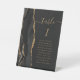 The left-hand edge of this elegant modern wedding table number pedestal features a black watercolor agate border trimmed with faux gold glitter. The word "table" appears in whimsical gold-coloured script on a slate black background. Add the names of your guests who are assigned to each table.