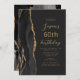 The left-hand edge of this elegant modern birthday party invitation features a black watercolor agate border trimmed with gold faux glitter. The customisable text combines gold-coloured script and sans serif fonts on a slate black background. The reverse side features a matching black and gold agate design.
