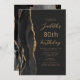 The left-hand edge of this elegant modern birthday party invitation features a black watercolor agate border trimmed with gold faux glitter. The customisable text combines gold-coloured script and sans serif fonts on a slate black background. The reverse side features a matching black and gold agate design.