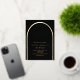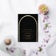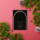 An elegant 50th birthday invitation. A black background with a golden arch on the front. Fifty is written with real gold foil