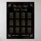 Using a sleek, retro font, I've created a graphic that reads "Please Find Your Seat". Framing embellishments with an Art Deco vibe were added to each corner. All these graphics were embellished with faux gold treatments. Complementary fonts and colors were used for the placeholder fields you'll edit as you personalize this design. All layers were added separately and left unlocked to give you considerable design control. Feel free to change the background color to anything you prefer. This setup has 12 tables laid out in three rows of four. Alternate versions of the header text graphics have been included but "turned off". You can see these by clicking the eyeball beside each layer, should you be interested in any changes in that area // 122 //