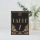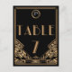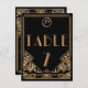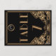 An elegant, vintage style wedding table number 7 (seven) postcard with a 1920's theme in black and shade of beige to simulate gold. A black background highlights the intricate geometric, Art Deco style border in golden tones. Both the Bride's and the Groom's monograms (initials) are highlighted by using a contrasting silver grey colour font. This is a two sided version of the table number however please note that being printed on postcard cardstock, only one side has a glossy finish.