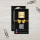 A classic black background. Decorated with a golden bown. Personalise and add your business logo, photo, name, title and contact information. Add your website url/link to the Qr code. With Facebook and Instagram icons. White text.