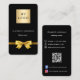 A classic black background. Decorated with a golden bow. Personalise and add your business logo, name, title and contact information. Add your website url/link to the Qr code. With Facebook and Instagram icons. White text.