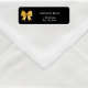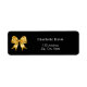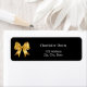 A black background decorated with a large golden bow. Personalise and add your name and address. White letters.