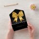 A black background, decorated with a large golden bow. Personalise and add names, party details, RSVP date, return address and name.