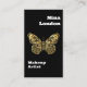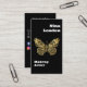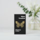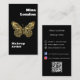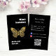 A black background. Decorated with a faux gold butterfly on the front. Personalise and add your business logo, name, title and contact information. Add your website url/link to the Qr code. With Facebook and Instagram icons. White text.