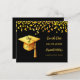 On front: A black background, golden text. Templates for a name and date. The name and the text: Save the Date are written with a modern hand lettered style script. With a faux gold cap, tassel topper.