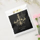 This design features elegant black background with a vintage golden colour chandelier. The damask gold chandelier reflects its shadow contrasting against the black. The combination of the black and gold colours creates a sophisticated, trendy and chic style. Elegant wedding favour bag design with modern elements. The simple setup of the typography gives it a distinct style. Matching wedding invitations and other stationery items are also available.
