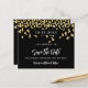 A black background decorated with faux gold confetti. Personalise and add a date and name/age. The text: Save the Date is written with a large trendy hand lettered style script. White text.