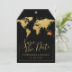 Black and Gold Luggage Tag Shaped Destination Wedding Save the Date with a faux gold foil world map and an editable heart location marker and romantic aeroplane icon. Select your own background colour on the back side of the tag card to coordinate with your travel theme wedding colours.