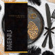 Looking for a wedding reception dinner menu? Look at our Black Gold Diamond Wedding Reception Dinner Menu! This stunning wedding luxury wedding menu features bold, modern typography with a striking digital gold effect on the frame and the word "menu" on the back. The word "Menu" dazzles with a captivating digital diamond effect, adding an extra touch of luxury. Set against a sleek black background, this design exudes elegance and sophistication, perfect for couples seeking a classy, contemporary style that stands out. Ideal for a glamourous, upscale celebration!