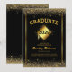 Modern graduation announcement card featuring a stylish black background with a gold glitter overlay, a motarboard with the class year on top, the students name, and their future plans.