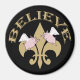 Keep hope on your fridge with this Black and Gold Fleur de Lis Flying Pigs magnet! Two winged pigs fly over a gold Fleur de Lis under the word "Believe" on a black background.