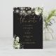 This elegant black and gold greenery floral save-the-date invitation can be personalised with your information in chic typography. Designed by Thisisnotme©